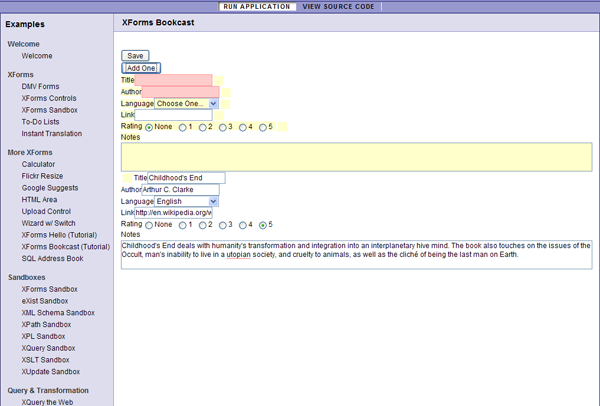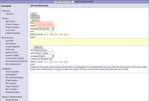 GETto the URL you have specified. The connection reaches the built-in eXist database, which returns the document calledbooks.xml. The content of that document reaches back the XForms engine, which stores it into thebooks-instanceinstance.The XForms engine updates the XForms controls bound to the instance with the values now contained in the instance. For example, the "title" and "author" input fields are now updated with the values that came from the database.