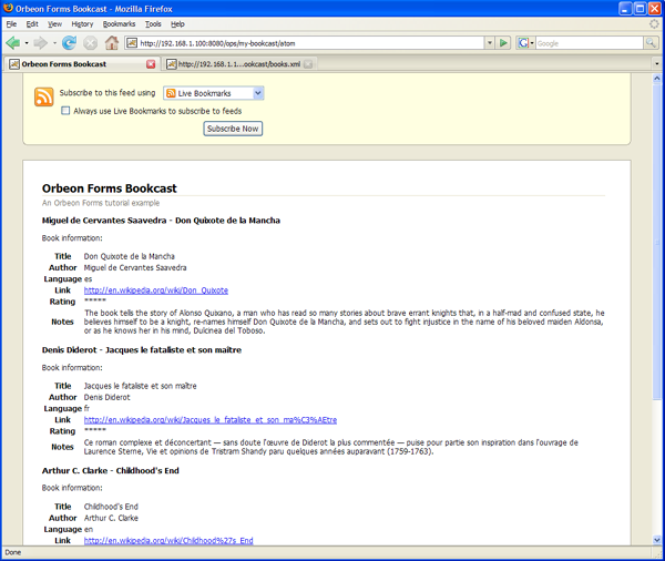 Remember, the name of this application is Bookcast, which lets suggest that we can expose the list of books as a feed of some sort. Here, you will use the [Atom Syndication Format][28] (or Atom in short). Atom is a format very much like RSS but it has been standardized by IETF and is much cleaner than RSS (note that there are at least 6 different versions of RSS). Atom is now supported by most feed readers.