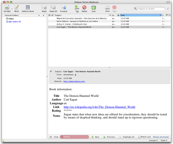 You can now try to load the feed into your favorite feed reader! Here is how the Bookcast feed looks in the Mozilla Thunderbird feed reader: